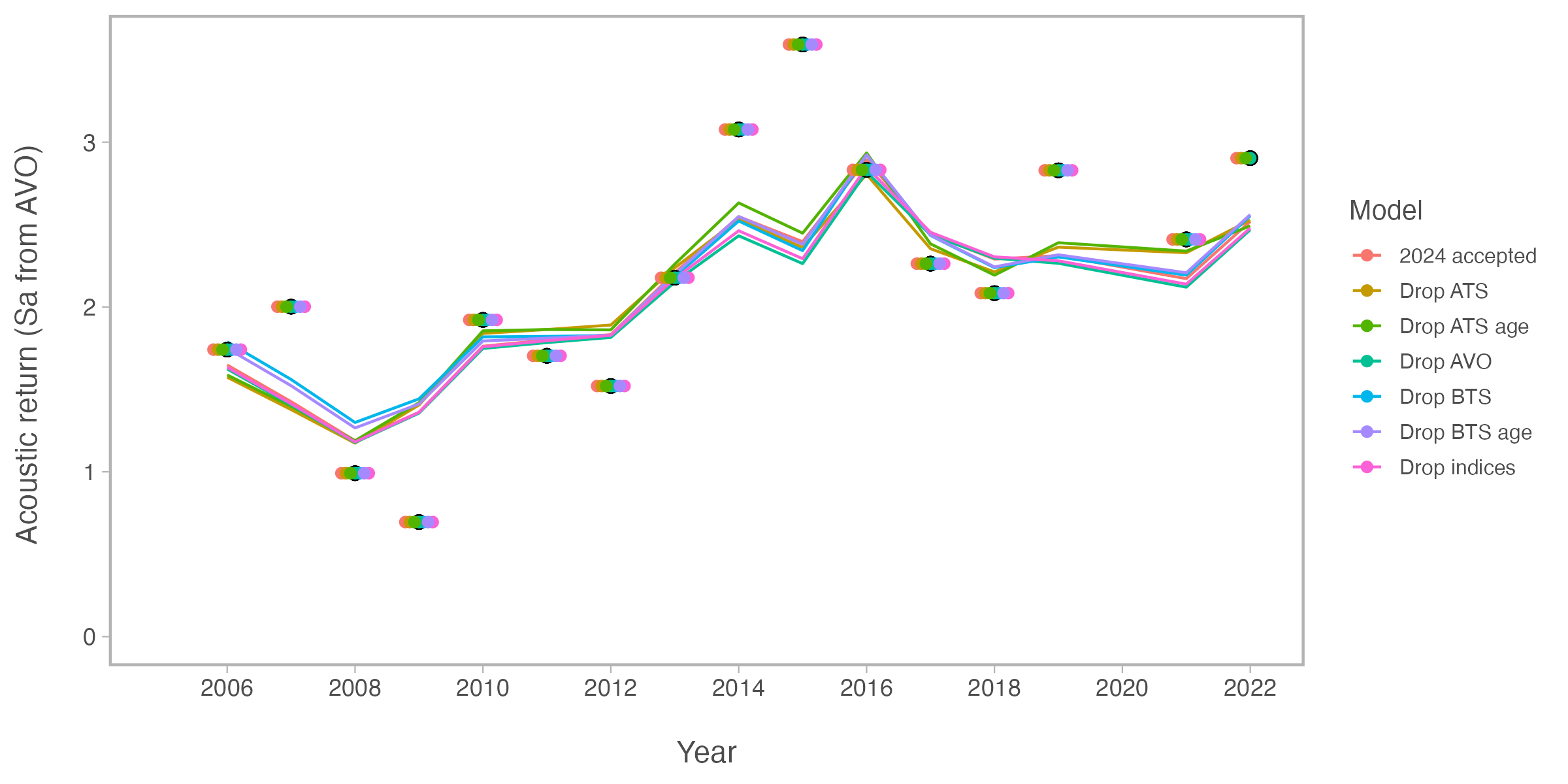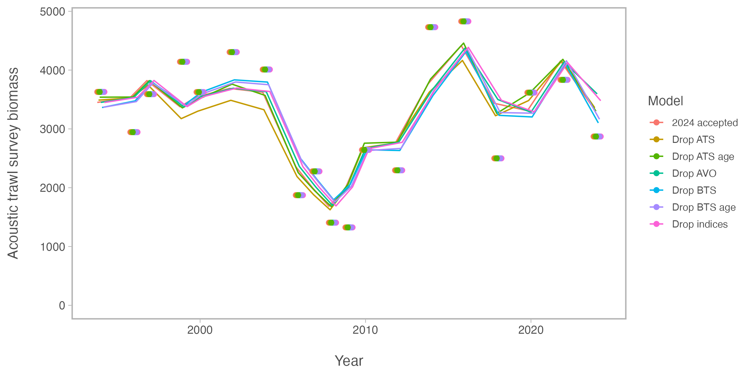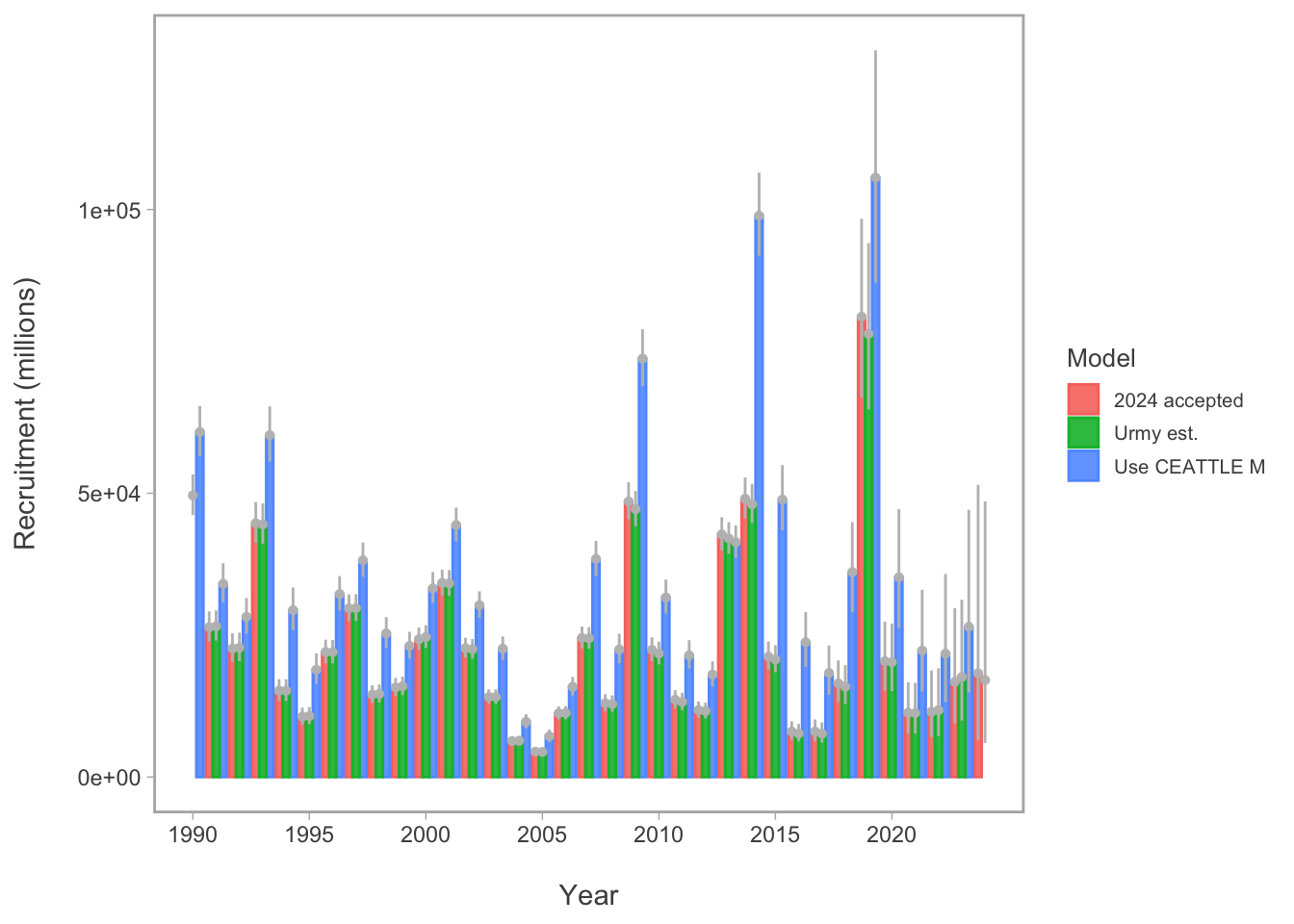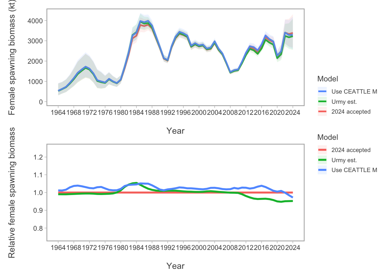 The next sections examine incorporation of multi-species natural mortality (M-at-age and year) estimates and revised acoustic-trawl survey uncertainty (see 4). CEATTLE-based M estimates led to higher mortality at many ages, resulting in higher recruitment but lower near-term spawning biomass relative to the 2024 base model. Alternative acoustic estimates (Urmy, Ressler, and De Robertis (2025)) had smaller effects on management benchmarks, but highlight areas for further refinement.