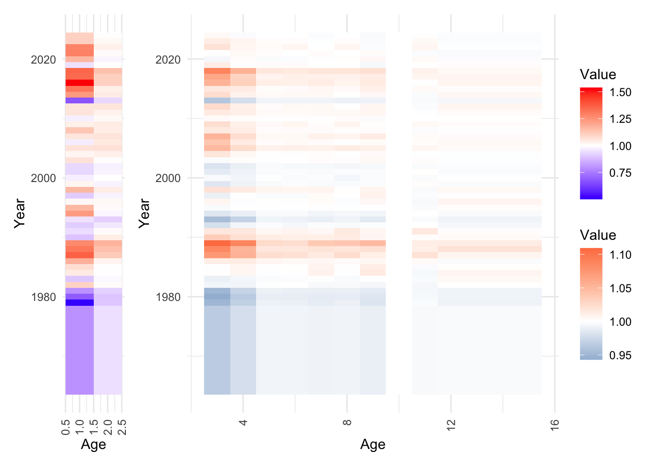 We estimated the spatial range assuming geometric isotropy (i.e, spatial autocorrelation declines with equal rates over distance in all cardinal directions). We used the same extrapolation grid as implemented for abundance indices, but here we modeled spatial and spatiotemporal fields with a mesh with a coarser spatial resolution than the index model, here using 50 “knots”. This reduction in the spatial resolution of the model, relative to that used for the abundance indices, was necessary due to the increased computational load of fitting multiple age categories.