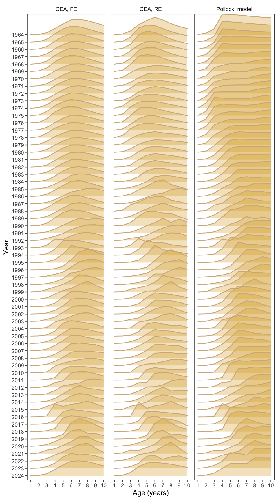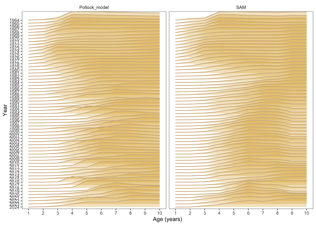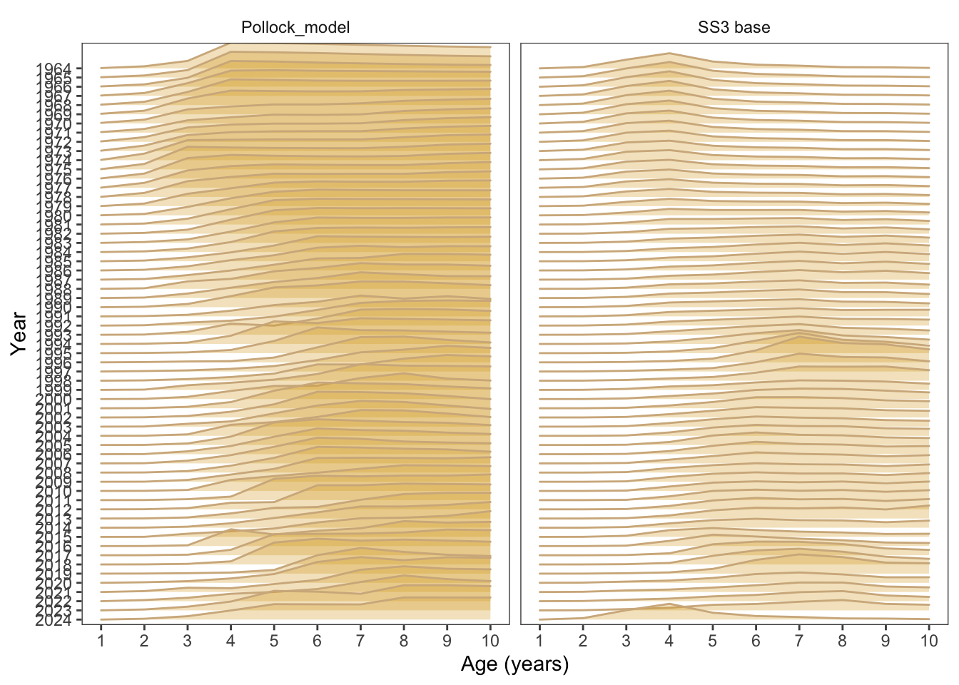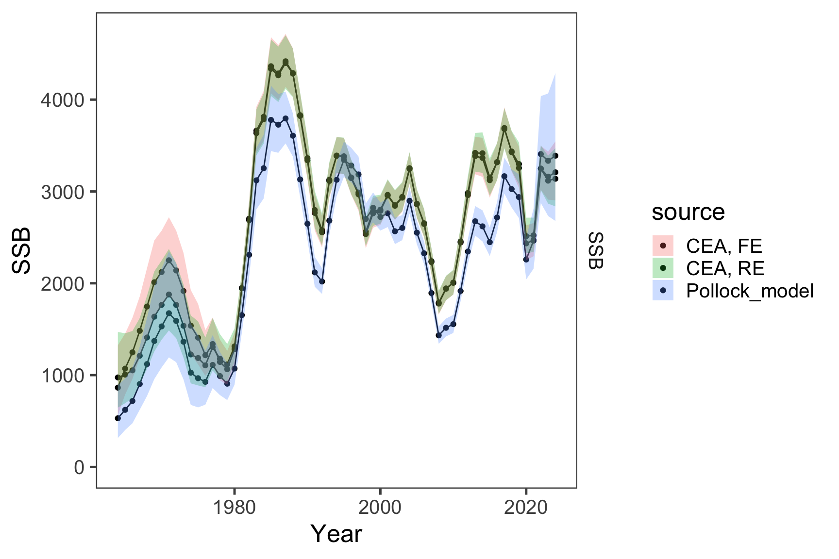 The Rceattle model is developed by the AFSC and is written in TMB (Adams et al. (2022)). The model is an extension of the ADMB version used for multi-species model in the Eastern Bering Sea (Jurado-Molina, Livingston, and Ianelli (2005), Holsman et al. (2024)) and has a number of newer features. It is flexible enough to include a variety of data types using lengths and can be set up for species tracked for sexually dimorphic growth and other processes. Since it has been recast into TMB, it allows for the ability to specify random effects in a number of processes. One development of the model is to have the flexibility to bridge among extant single-species modeling platforms by using it in “single-species” mode. To illustrate that, we introduce an application of Rceattle to the EBS pollock data set. The model is still under development, but we present preliminary results for consideration. Initial runs are favorable and we were able to have time-varying selectivity treated as fixed-effects (meaning penalty weights pre-specified) but also with them specified as random effects (with the penalty “variances” estimated (Figure 29). The model estimates of SSB are similar to the 2024 model but more work is needed to understand where differences remain in the model specification (Figure 30).