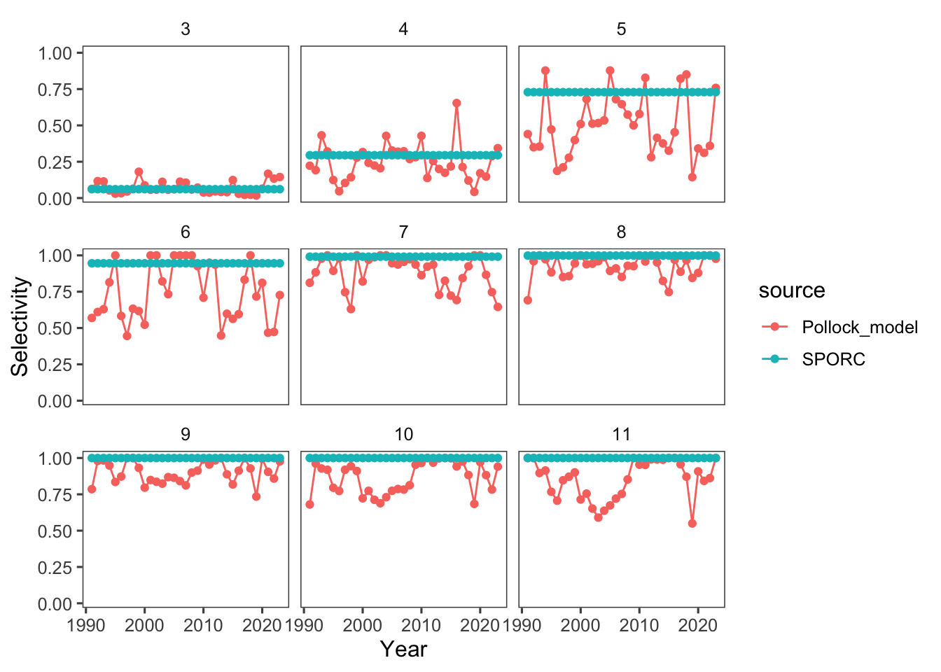 (a) Model estimates of selectivity comparing last year’s model with the SPock model.