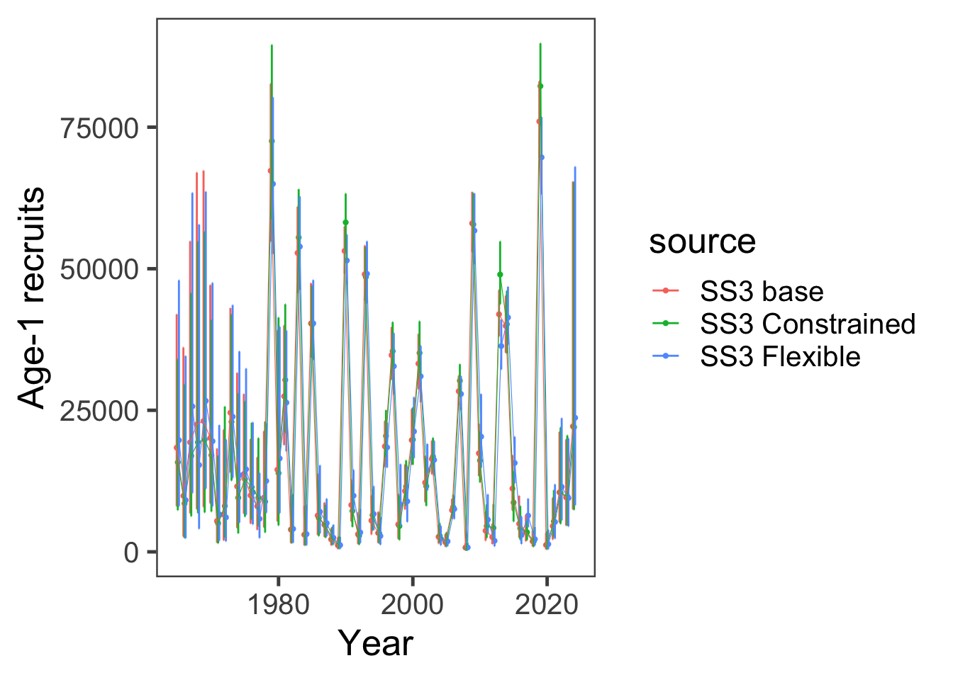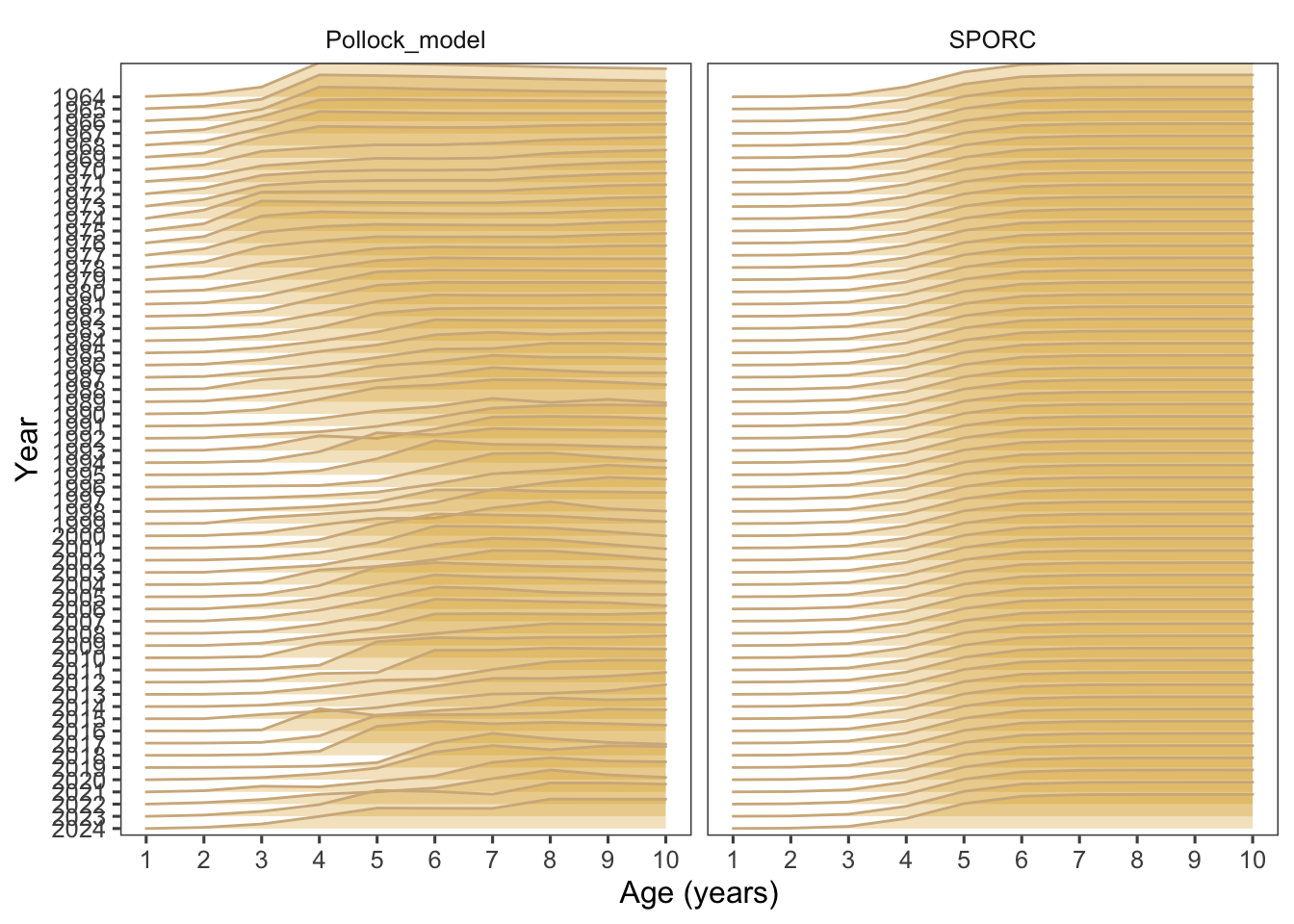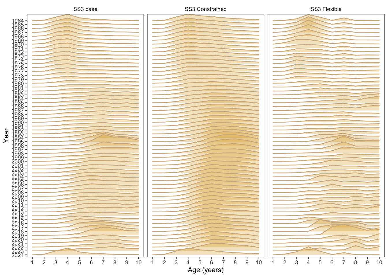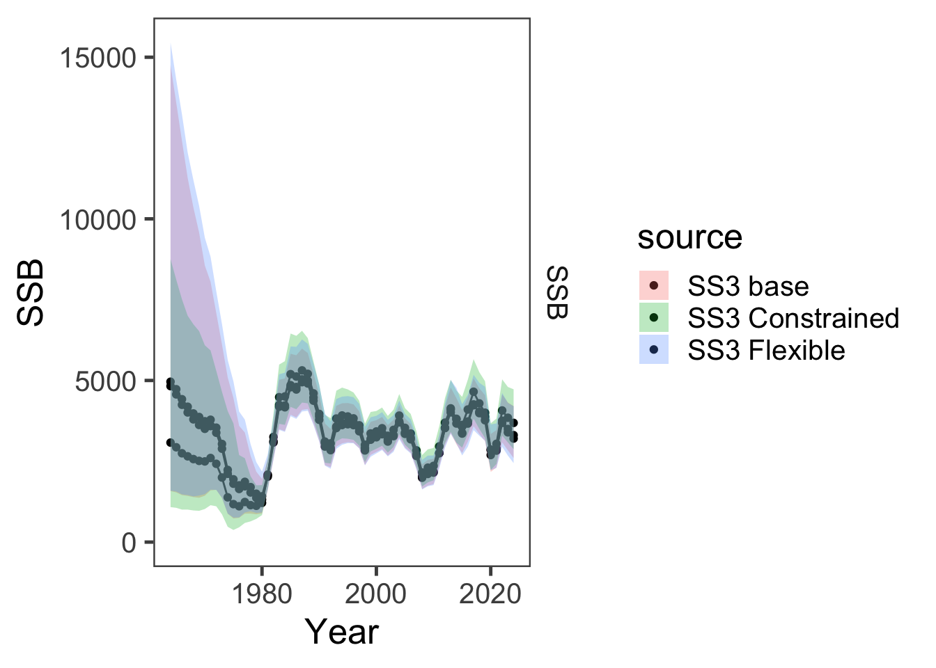 In the fifth section we evaluated some alternative assessment platforms (see 5), including SS3, SAM, Rceattle, and a spatial RTMB model. Results demonstrated broad consistency in stock trends but revealed platform-specific differences in selectivity, recruitment, and uncertainty. Early applications of Rceattle and spatial models suggest promising avenues for bridging across platforms and explicitly modeling spatial or sex-specific processes.