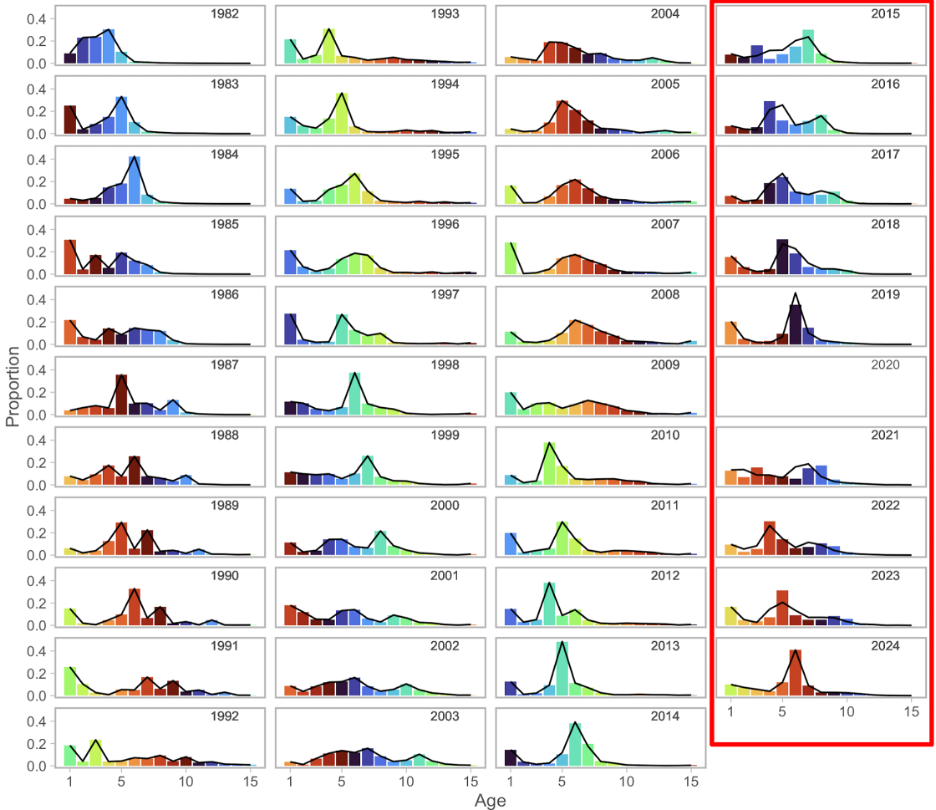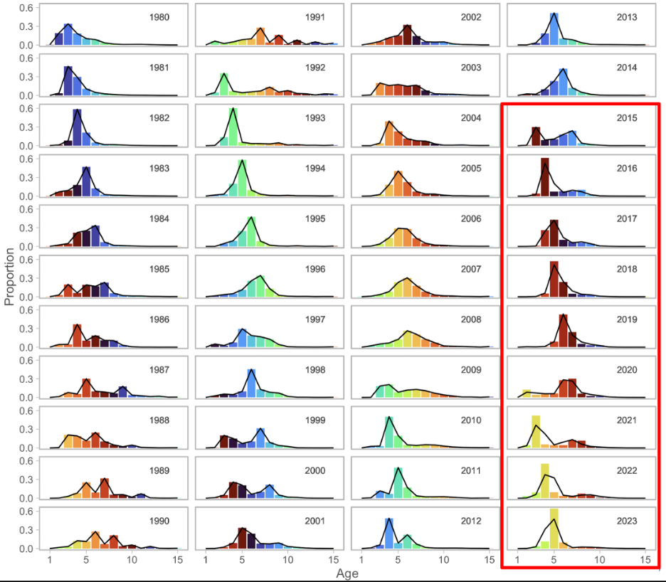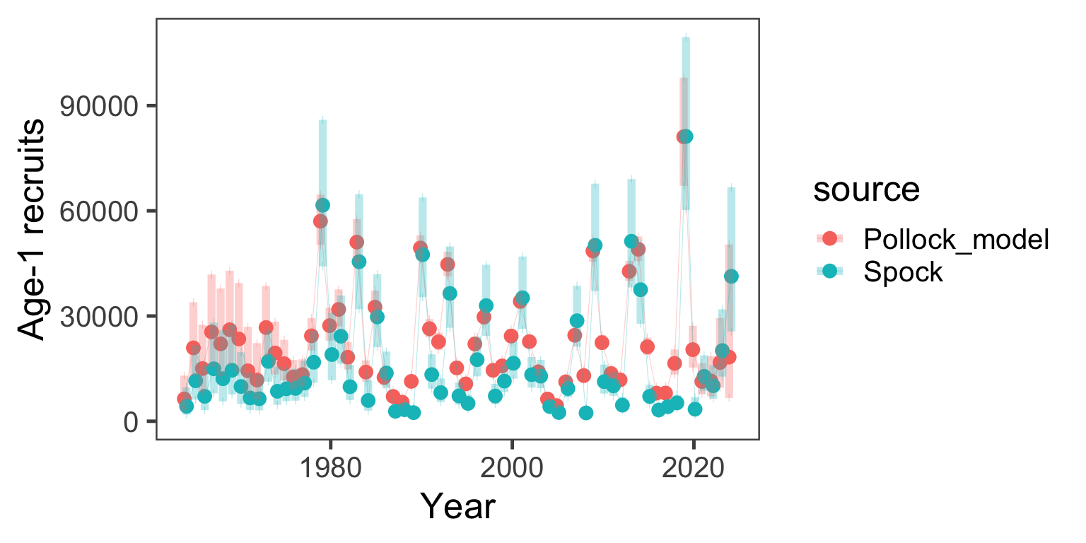 The next section we presented bottom-trawl survey spatial distribution modeling (see 6), using sdmTMB and tinyVAST. Model-based indices and age compositions incorporated environmental covariates such as cold-pool extent and bottom temperature, improving robustness in years with sparse coverage. The resulting indices were consistent with design-based estimates, but offered improved diagnostics and continuity across survey years.