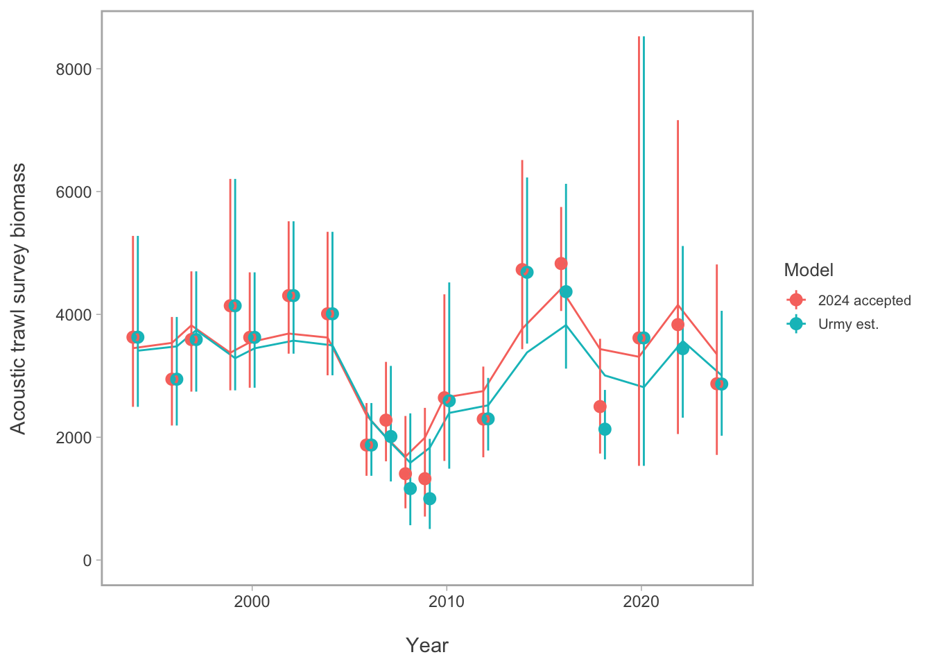 Figure 34: Model results comparing last year’s model with the revised sdmTMB model.