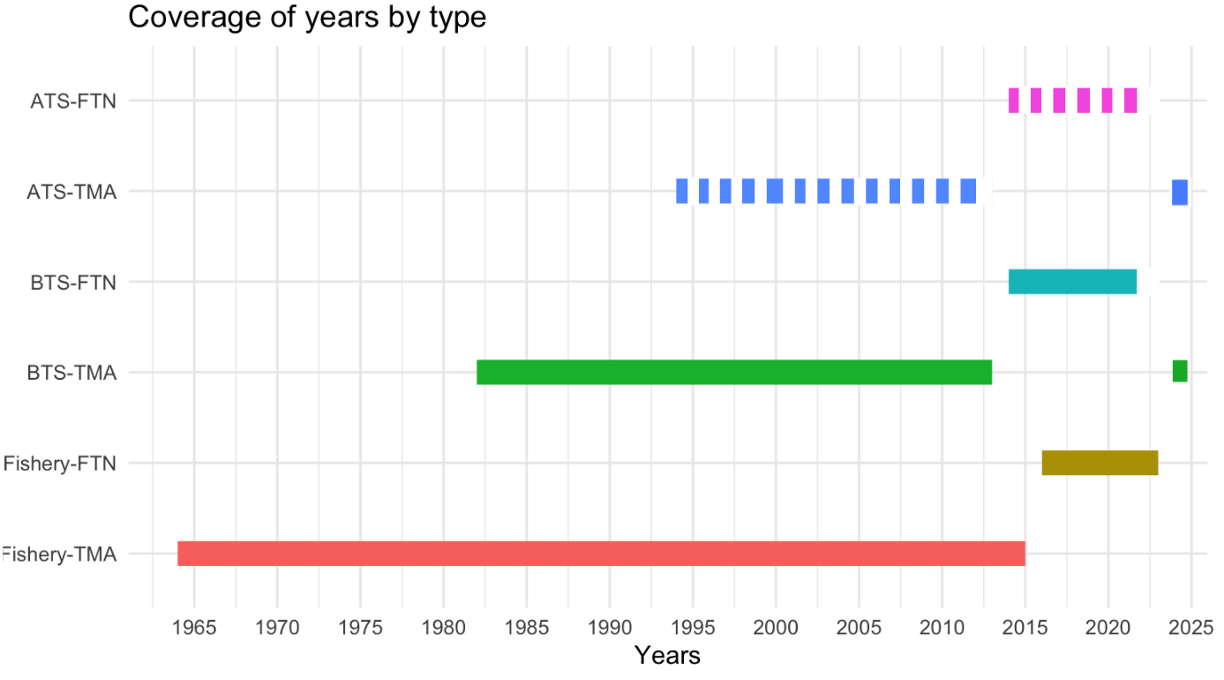 Figure 7: Data extent by age composition for the models with FTNIRs age estimates. The data types are for the Fishery, bottom trawl survey (BTS), and acoustic trawl survey (ATS) and the years of coverage are shown in the x-axis.