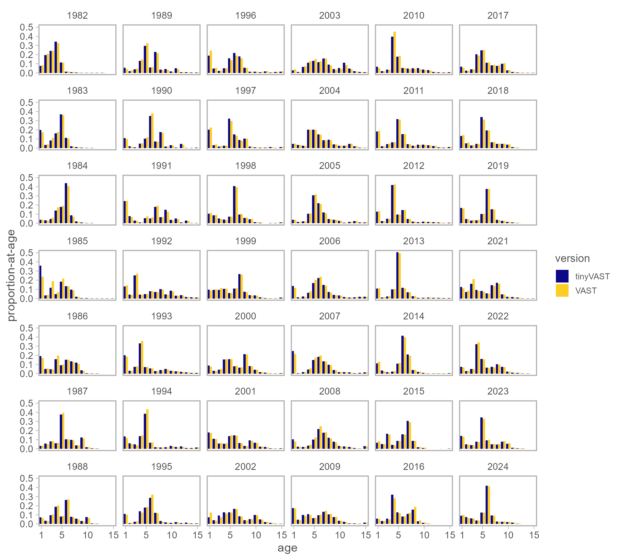 We computed these estimates in the tinyVAST R package (https://vast-lib.github.io/tinyVAST; Thorson et al. (2024)), assuming a Poisson-link delta-model (Thorson 2018) involving two linear predictors, and a gamma distribution to model positive catch rates. We did not include any density covariates in estimation of age composition for consistency with models used in the previous assessments and due to computational limitations.