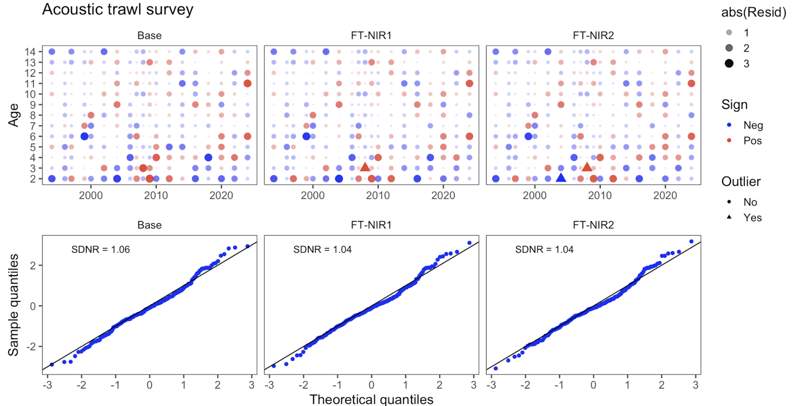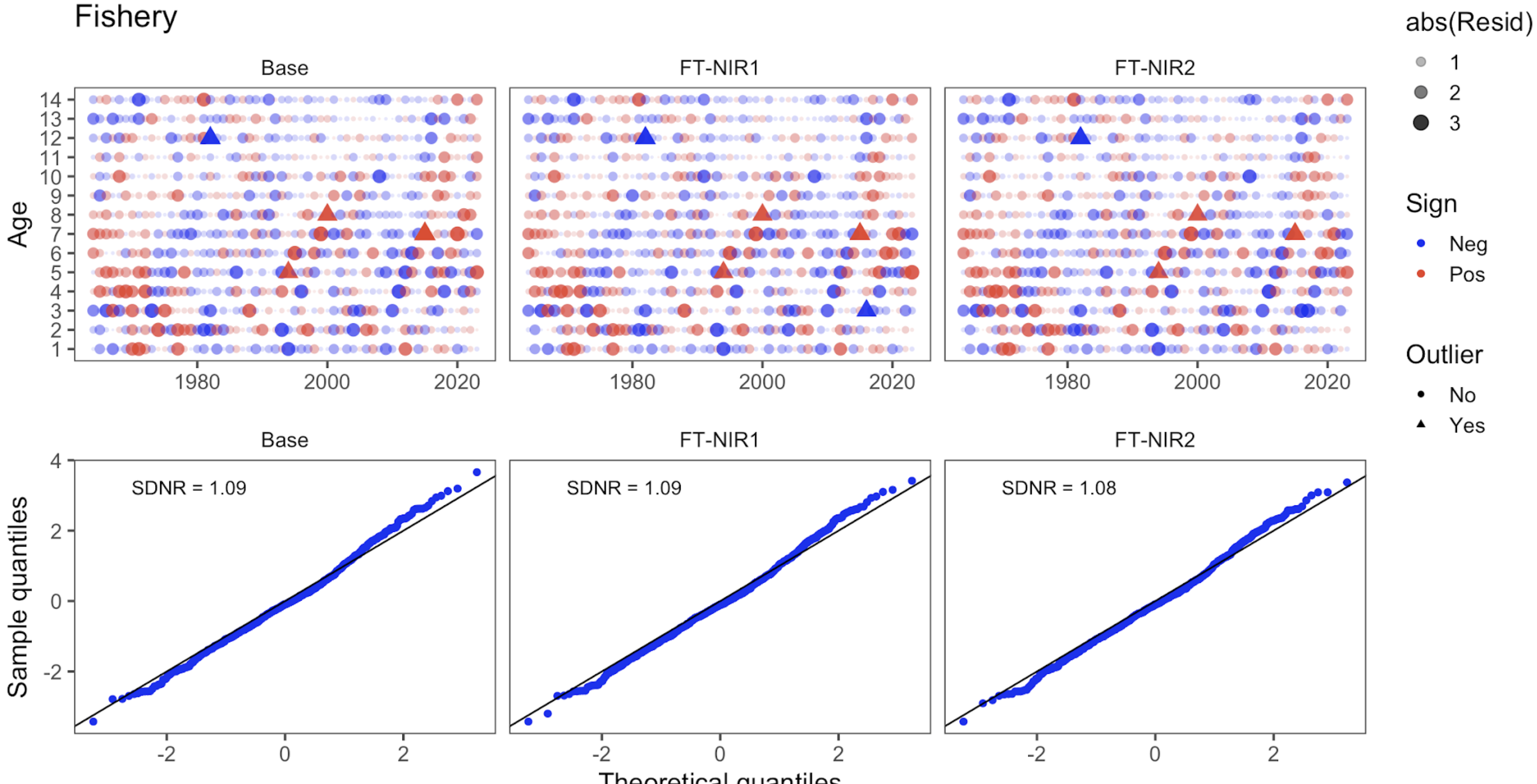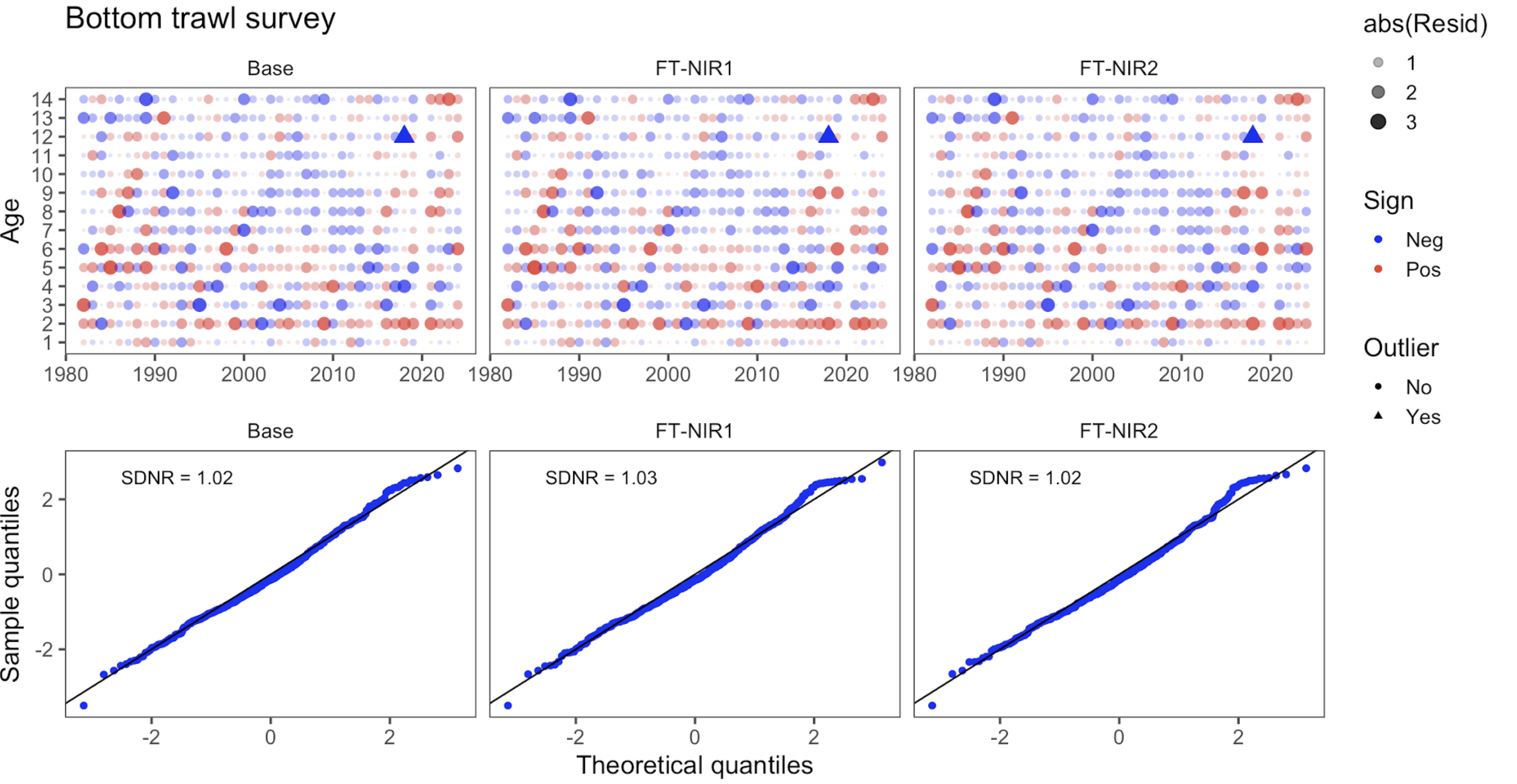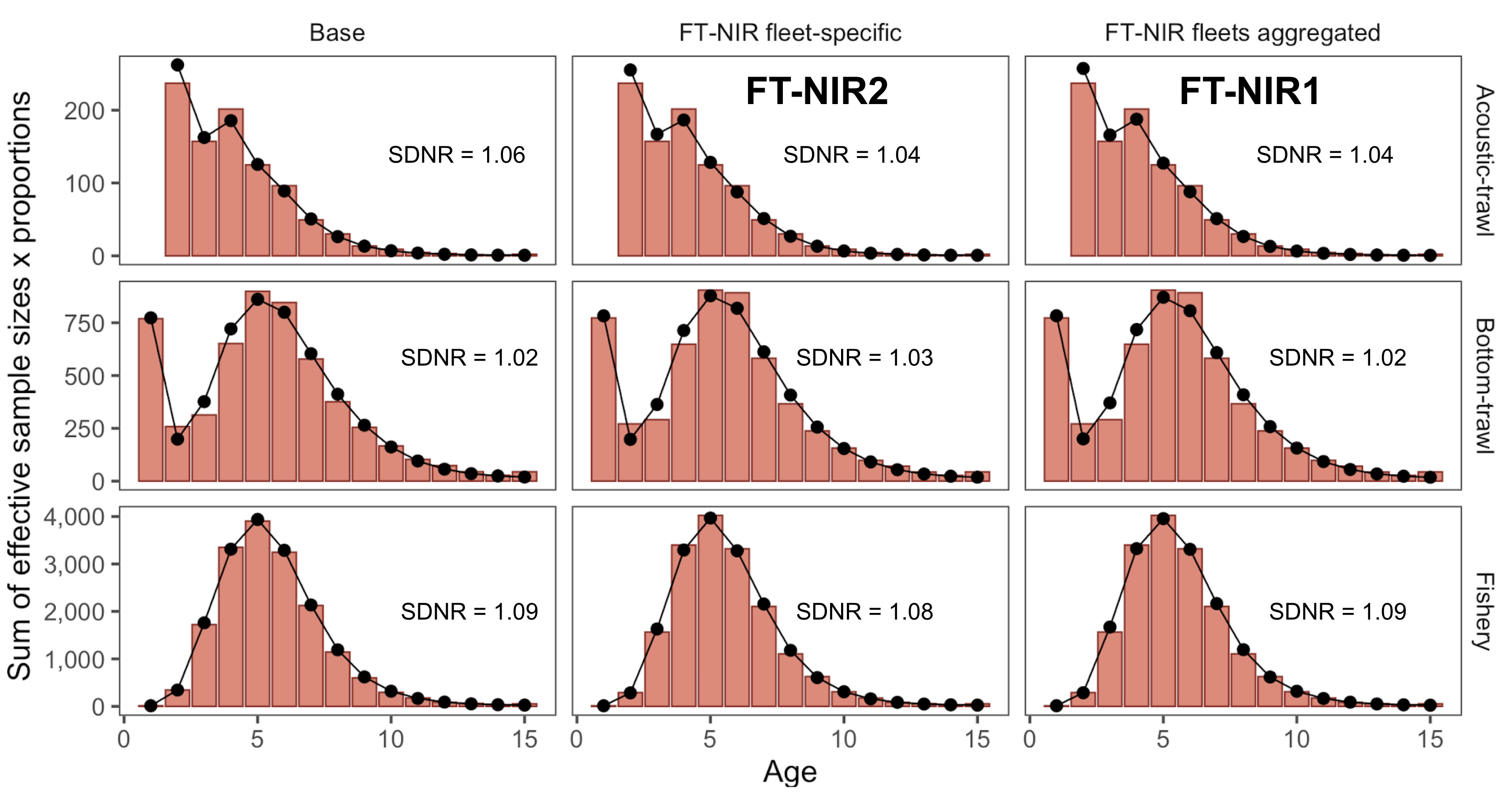 The second section presents comparisons of FT-NIR and traditional microscope age estimates (see 2). FT-NIR offers efficiencies but showed lower cohort consistency in bottom-trawl data compared to traditional ageing. Model runs incorporating FT-NIRs demonstrated that treatment of ageing error (fleet-aggregated vs. fleet-specific) influences perception of spawning biomass and reference points, though management quantities remained broadly comparable.