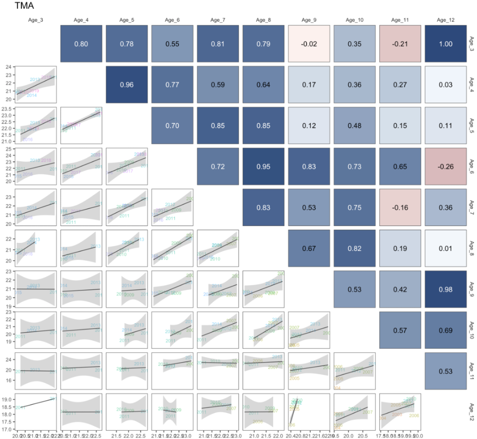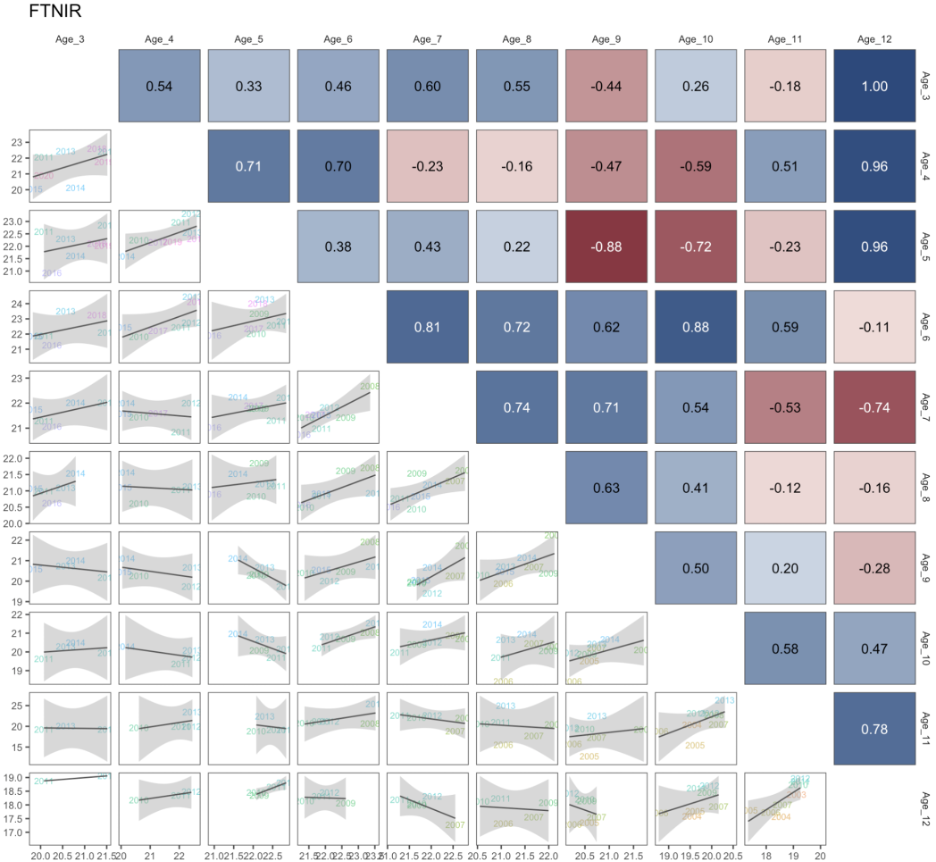 Examining the abundance-at-age (for design-based estimates of the bottom-trawl age compositions) we show that in general, the TMA estimates show a high level of consistency by cohort (Figure 1). For these same data, when applied to the FTNIRs age-estimation method, the consistency was lower (Figure 2). The extent that this is a concern is unknown.