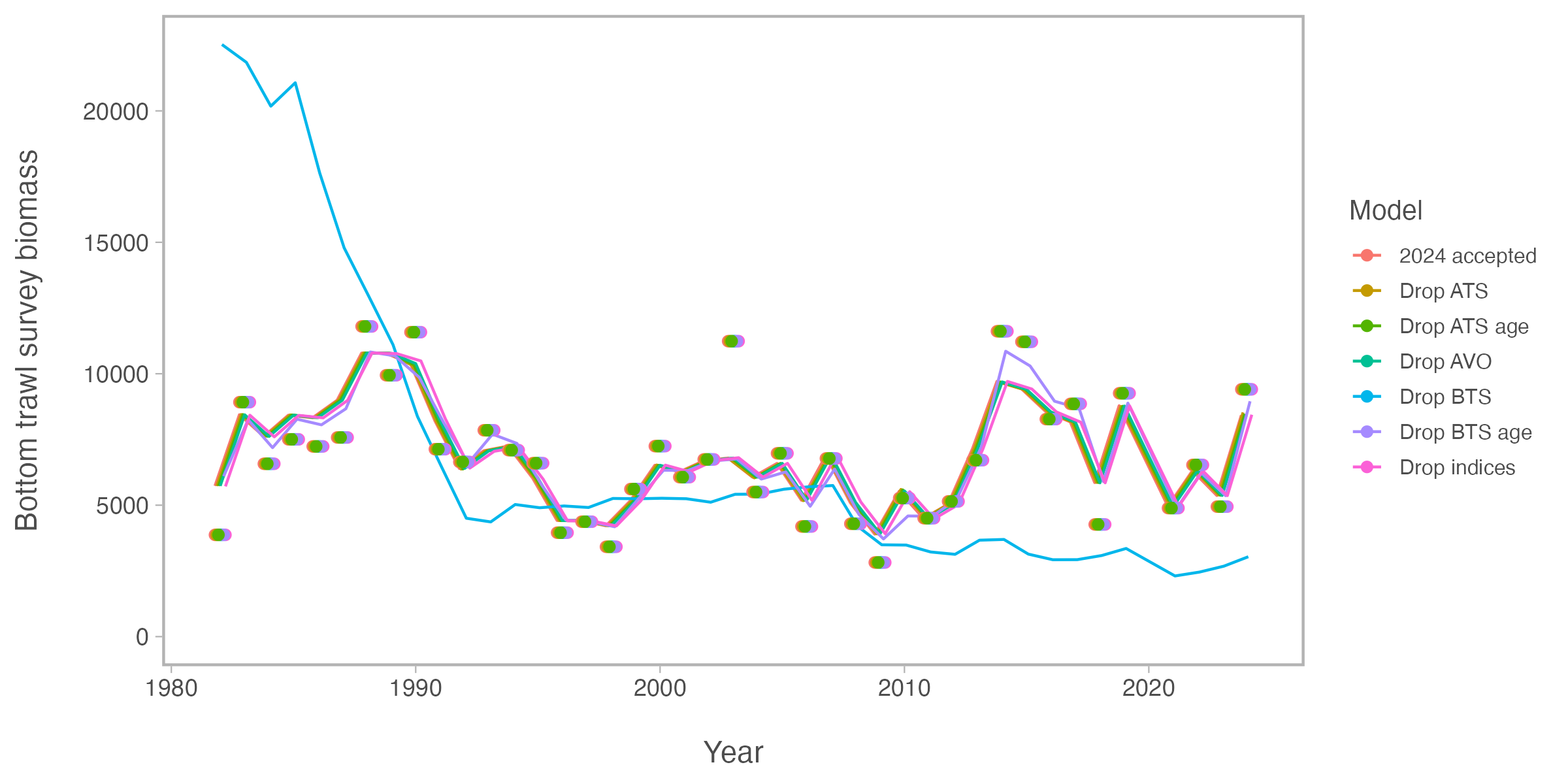 Among these models, downweighting the BTS data (both solely downweighting the BTS age composition data and downweighting all BTS data) led to changes in trends over time in estimated spawning biomass Figure 12 . The model estimates of recruitment were variable across sensitivity runs, but estimates differed the most from the 2024 accepted model when all BTS data were downweighted Figure 13. Estimates of BTS survey biomass fit the BTS data very poorly in most years when the BTS data were downweighted (Figure 14). Additionally, the fits to the BTS survey biomass were affected by downweighting the BTS age composition data (without downweighting the BTS survey index). The model was relatively insensitive to other data being excluded, and fits to the ATS and AVO indices were relatively insensitive to downweighting the BTS data (see Figure 14, Figure 15, and Figure 16). The root mean square error (RMSE) in Table 5 for the model run that downweighted all BTS data was large and the and effective sample size (Eff. N) was low as compared to the 2024 accepted model. Additionally, downweighting solely the BTS age composition data led to low effective sample size for the BTS.