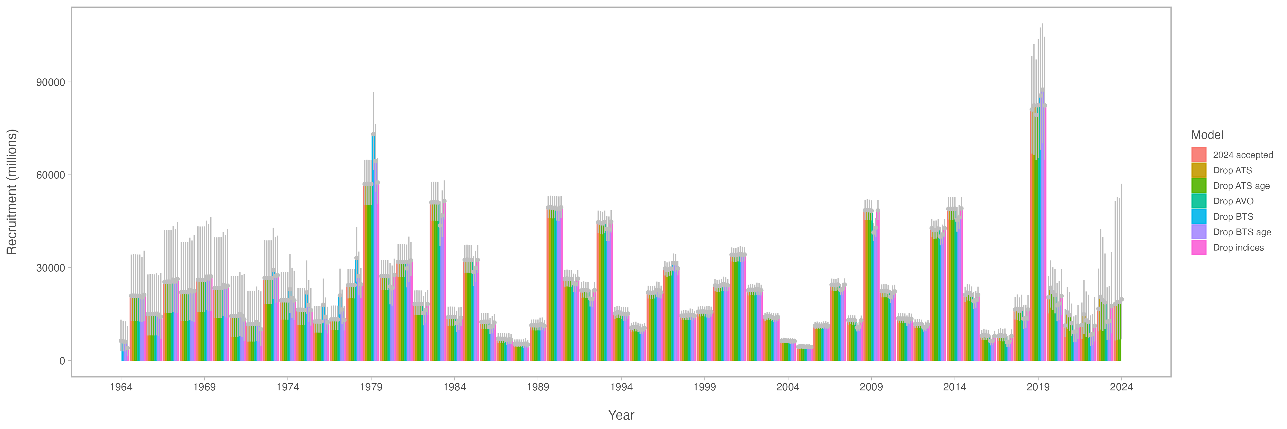 Figure 13: Comparison of recruitment estimates for models that downweight one data source at a time