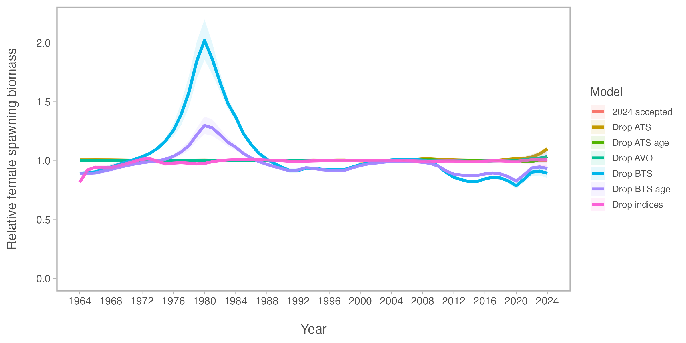 In the next section we explore leave-one-out survey sensitivity analyses (see 3). Results indicated that the influence of the bottom-trawl survey (BTS) was largest. Spawning biomass and recruitment estimates changed considerably when BTS data were downweighted. Other data sources, such as ATS and AVO indices, contributed less to overall stock trends.