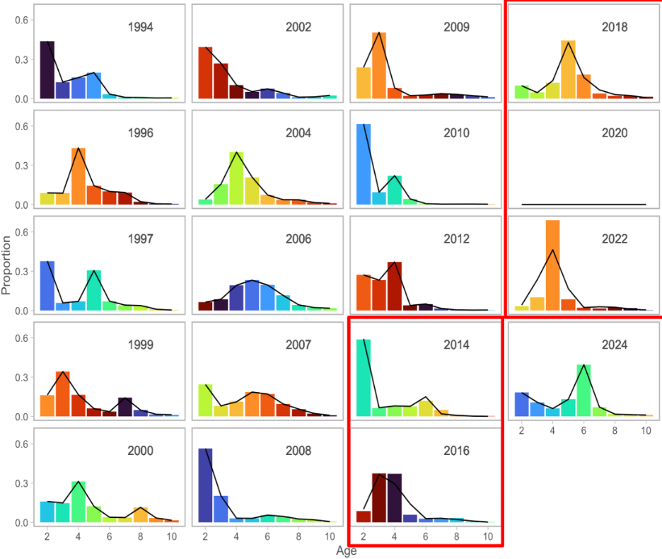 Grandin, C. J., K. F. Johnson, A. M. Edwards, and A. M. Berger. 2024. “Status of the Pacific Hake (Whiting) Stock in U.S. And Canadian Waters in 2024.” Joint Technical Committee of the U.S.; Canada Pacific Hake/Whiting Agreement, National Marine Fisheries Service; Fisheries; Oceans Canada.